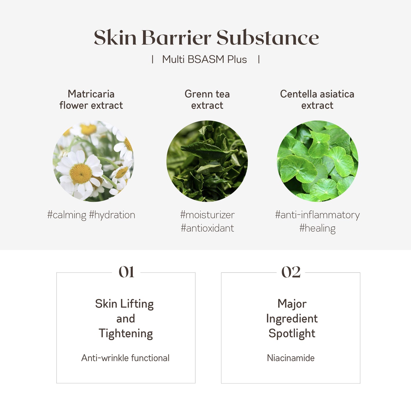 Cyclopentasiloxane, Pentylene Glycol, Niacinamide, Glycerin, Macadamia Integrifolia Seed Oil, Cetyl Ethylhexanoate, Phosphatidylcholine, Simmondsia Chinensis (Jojoba) Seed Oil, Polyglyceryl-3 Methylglucose Distearate, Olea Europaea (Olive) Fruit Oil, Cetearyl Alcohol, Beeswax, Glyceryl Stearate, Sorbitan Stearate, Arginine, Carbomer, Palmitic Acid, Stearic Acid, Acrylates/C10-30 Alkyl Acrylate Crosspolymer, Tocopherol, Xanthan Gum, Butylene Glycol, Myristic Acid, 1,2-Hexanediol, Tocopheryl Acetate, Sodium Hyaluronate, Garcinia Cambogia Fruit Extract, Centella Asiatica Extract, Glycine, Scutellaria Baicalensis Root Extract, Polygonum Cuspidatum Root Extract, Hydrolyzed Collagen, Caffeine, Serine, Glutamic Acid, Glycyrrhiza Glabra (Licorice) Root Extract, Camellia Sinensis Leaf Extract, Aspartic Acid, Leucine, Chamomilla Recutita (Matricaria) Flower Extract, Rosmarinus Officinalis (Rosemary) Leaf Extract, Alanine, Lysine, Tyrosine, Phenylalanine, Proline, Threonine, Valine, Isoleucine, Histidine, Cysteine, Methionine, Adenosine, Chlorphenesin, Disodium EDTA, Fragrance